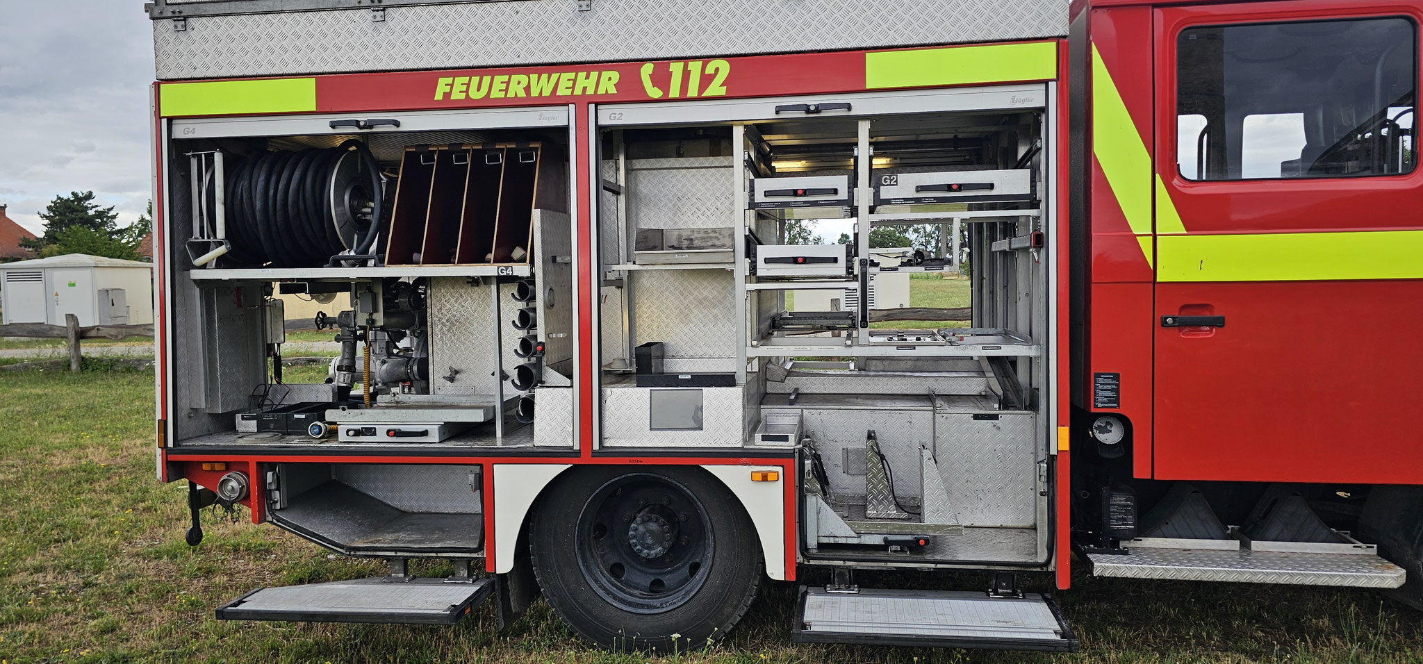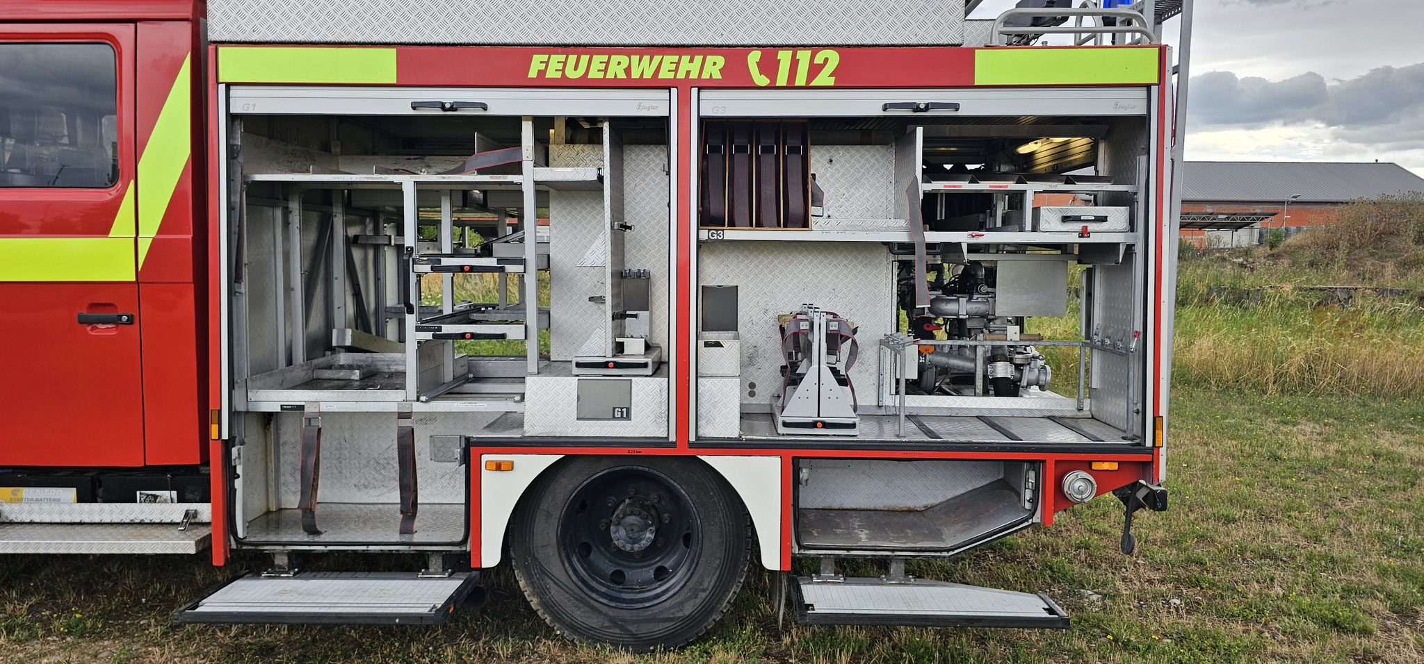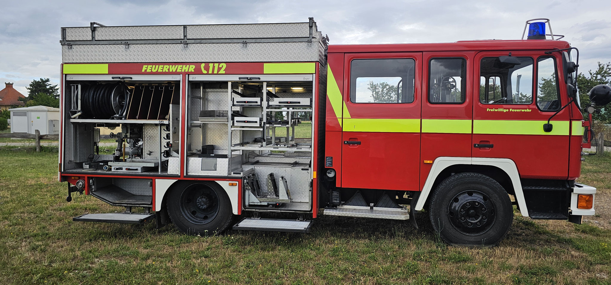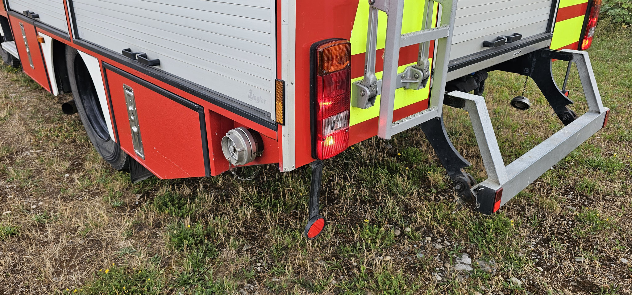 Sondersignal, Funk vorbereitet, Wassertank 1640 Liter, Heckpumpe Ziegler 16/8, formstabiler Schnellangrffschlauch, Teleskoplichtmast zwischen Fahrerhaus und Kofferaufbau,