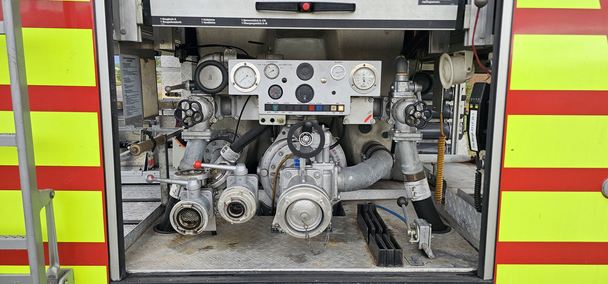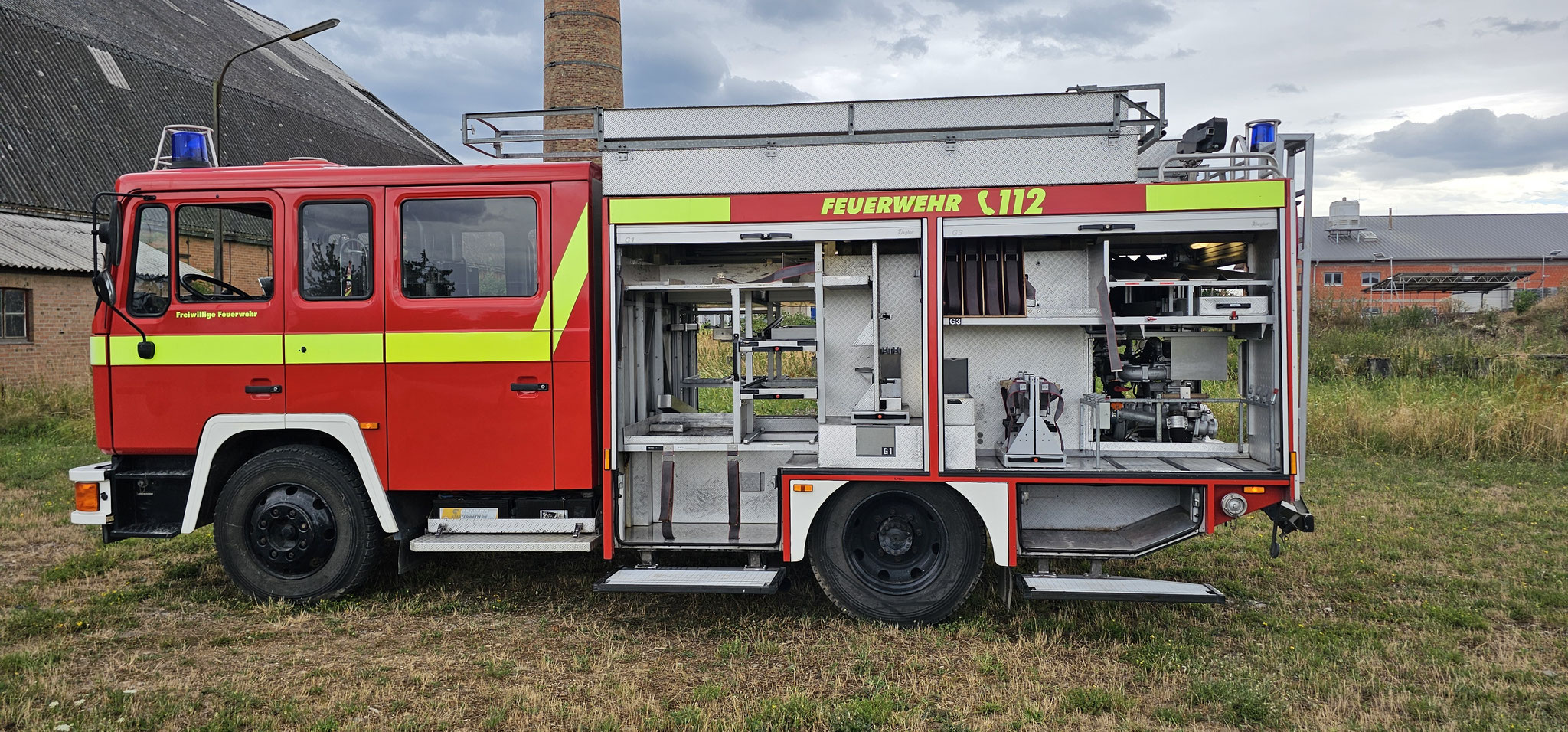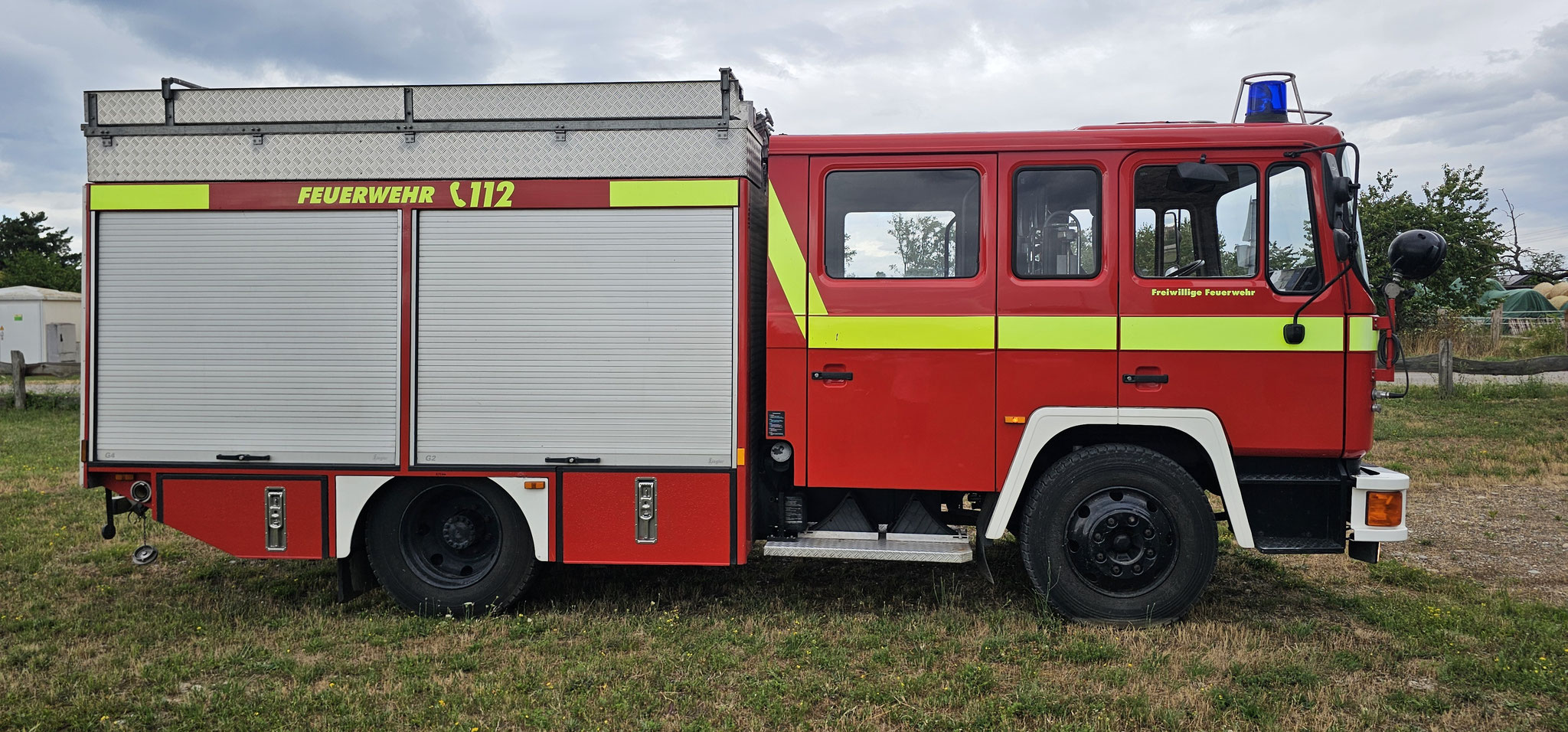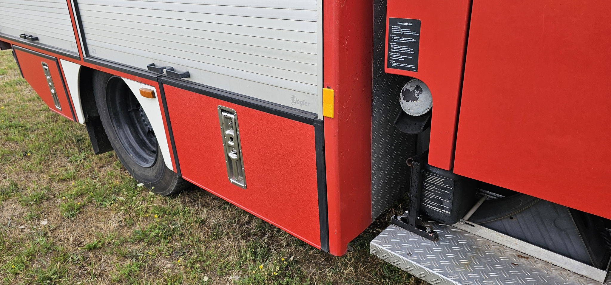Sondersignal, Funk vorbereitet, Wassertank 1640 Liter, Heckpumpe Ziegler 16/8, formstabiler Schnellangrffschlauch, Teleskoplichtmast zwischen Fahrerhaus und Kofferaufbau,
